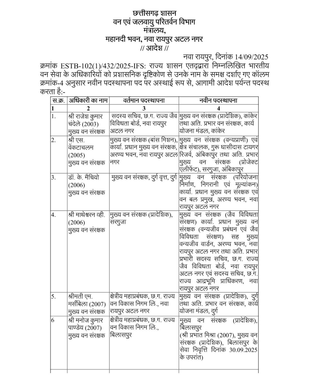 सीजी न्यूज ऑनलाइन 15 सितंबर। छत्तीसगढ़ शासन के वन एवं जलवायु परिवर्तन विभाग ने भारतीय वन सेवा अधिकारियों का बड़ा तबादला आदेश जारी किया है। इनमें बिलासपुर परिक्षेत्र में विशेष बदलाव किए गए हैं। बिलासपुर में अब तक मुख्य वन संरक्षक (प्रादेशिक) के रूप में कार्यरत प्रभात मिश्रा (2007 बैच) 30 सितम्बर को सेवानिवृत्त हो रहे हैं। उनके बाद यह जिम्मेदारी मनोज कुमार पाण्डेय (2007 बैच) को दी गई है।