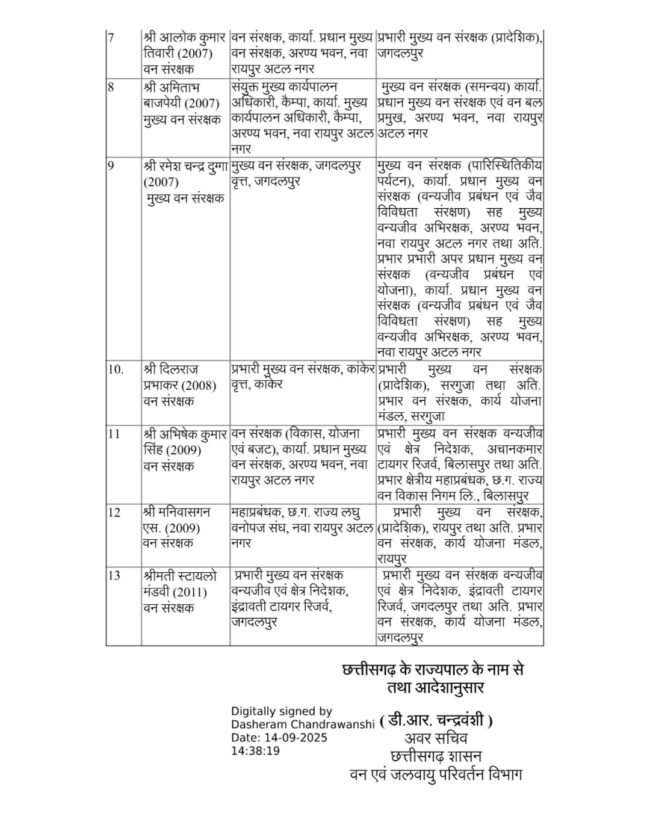 आलोक कुमार (2007 बैच) – वन संरक्षक, जगदलपुर एवं प्रभारी मुख्य वन संरक्षक (प्रादेशिक), जगदलपुर।
