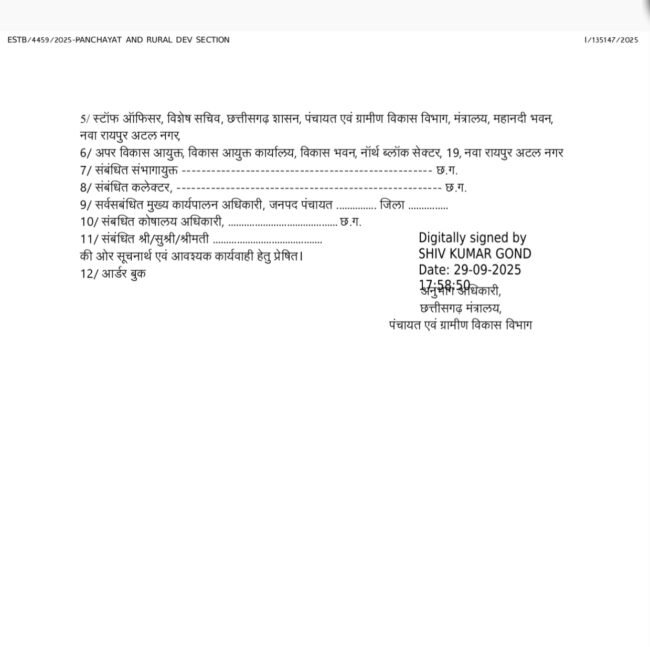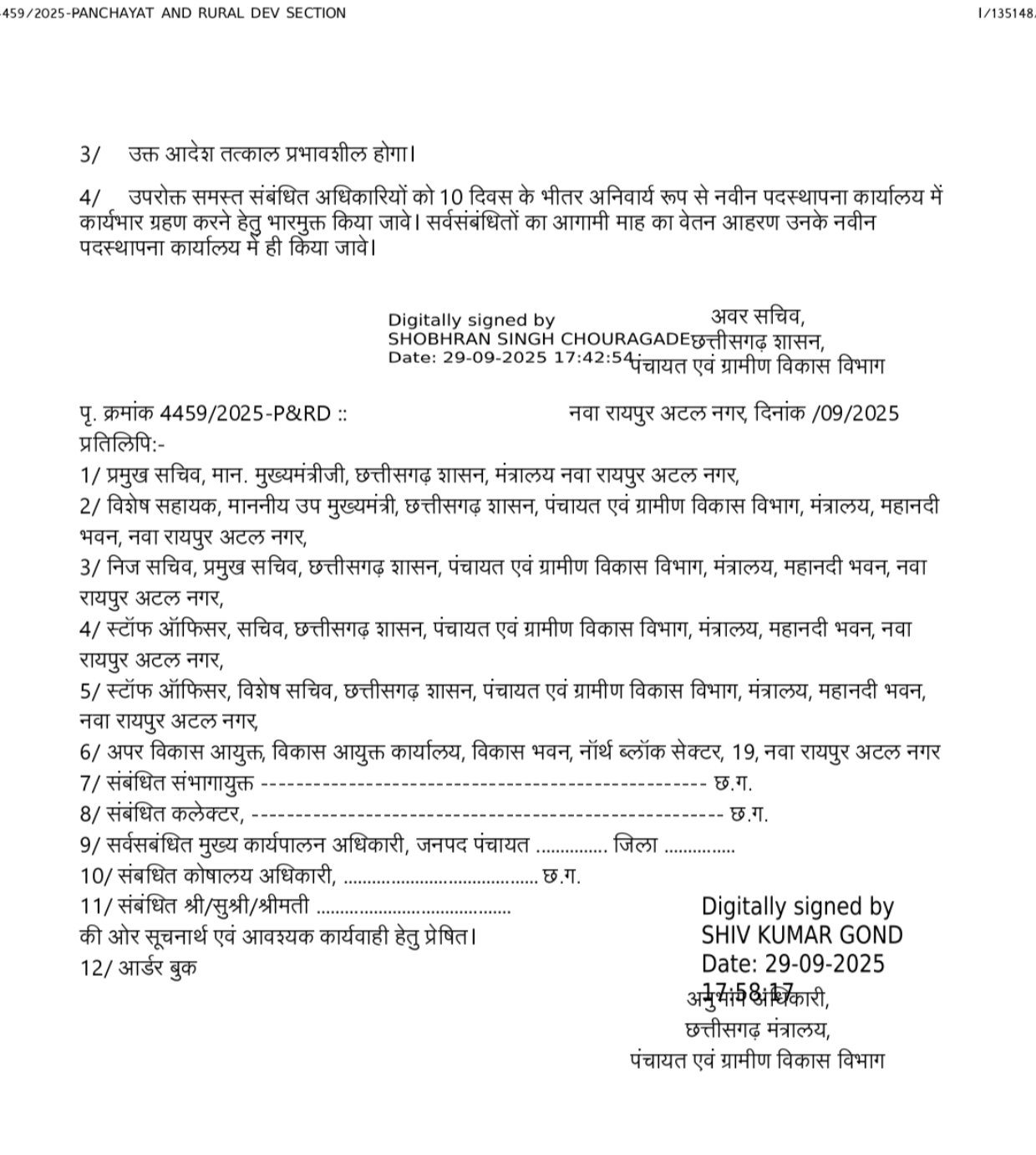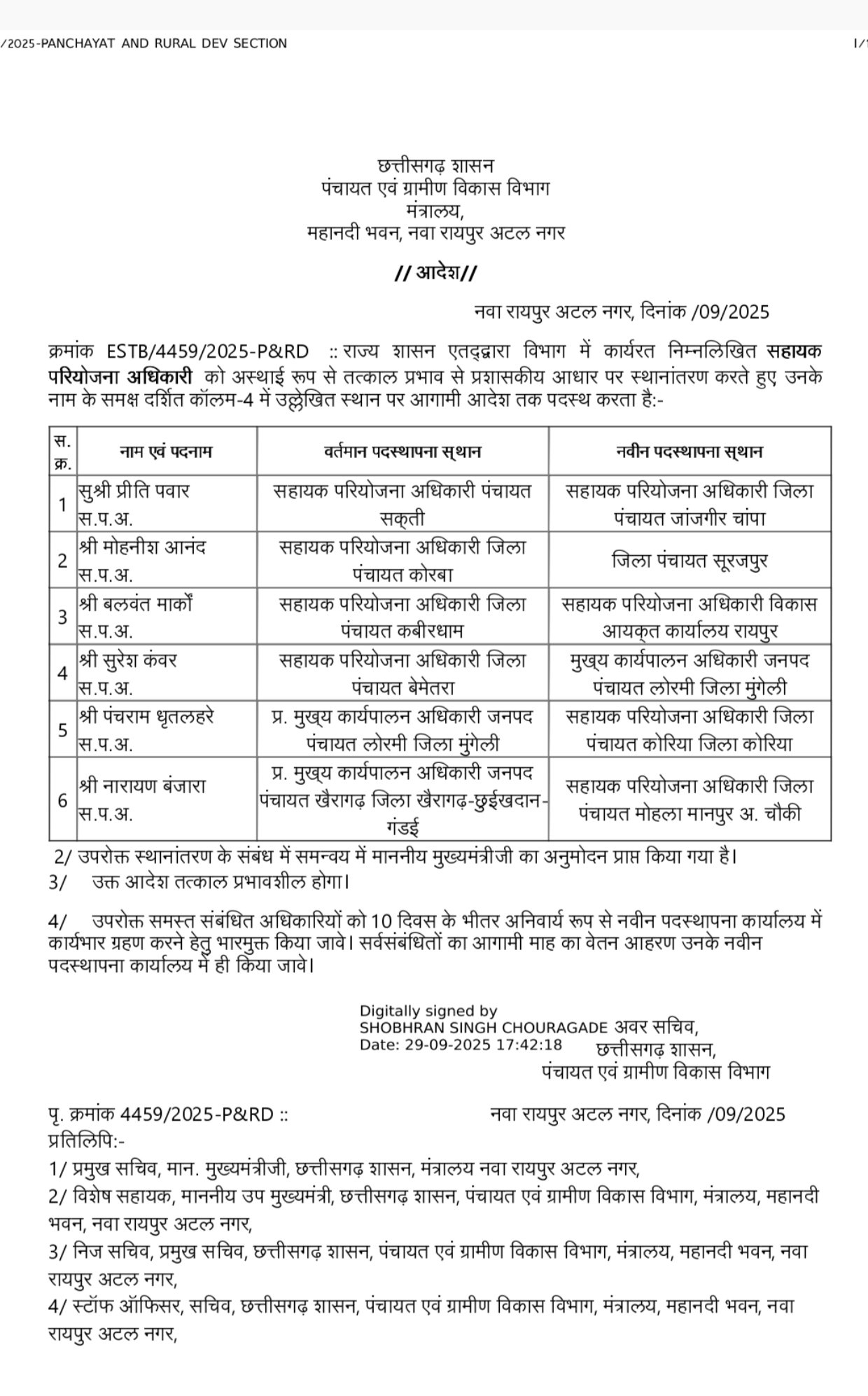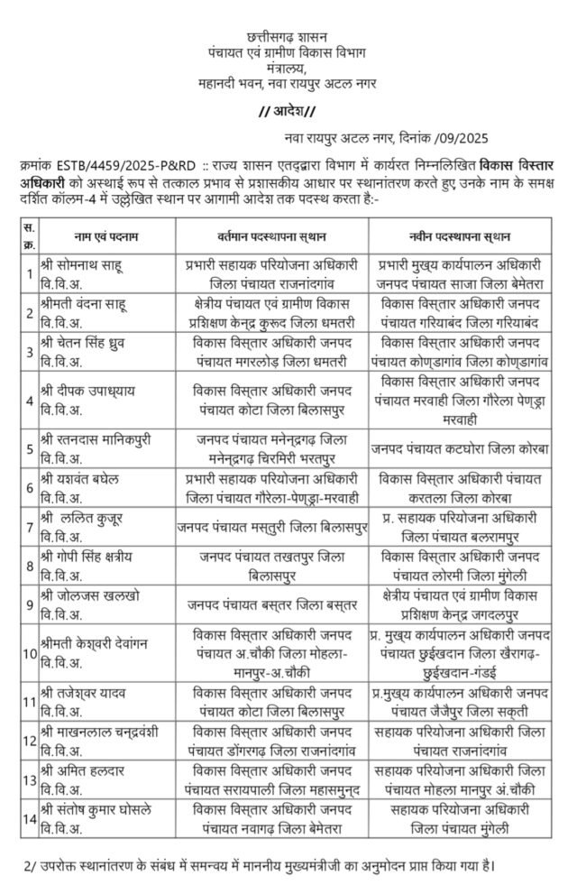 सीजी न्यूज ऑनलाइन 30 सितंबर। मुख्यमंत्री विष्णु देव साय के अनुमोदन पर पंचायत ग्रामीण विकास विभाग ने 14 विकास विस्तार अधिकारियों के तबादले किए हैं। इनमें से तीन प्रभारी सीएमओ बनाए गए हैं।