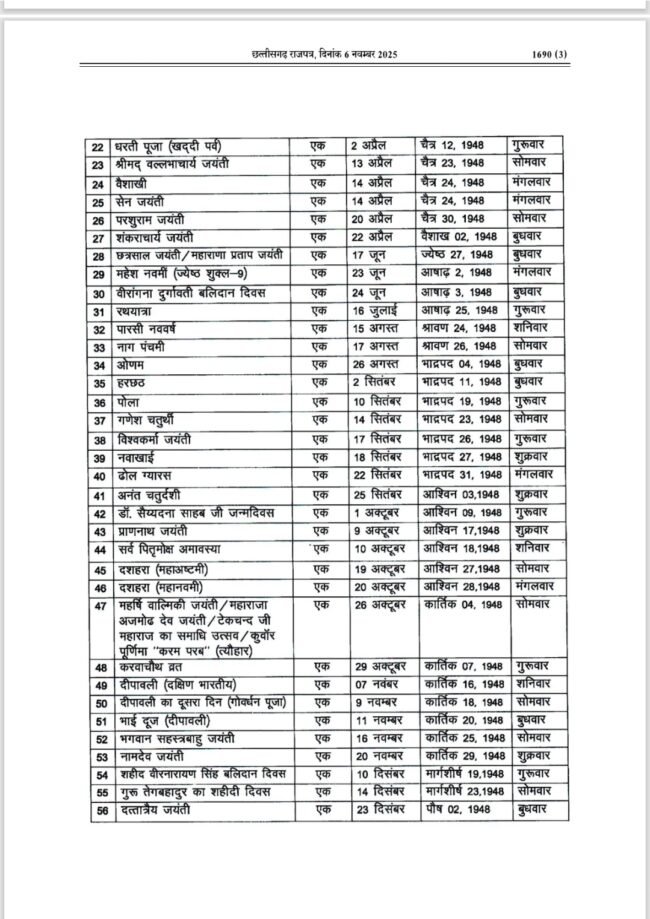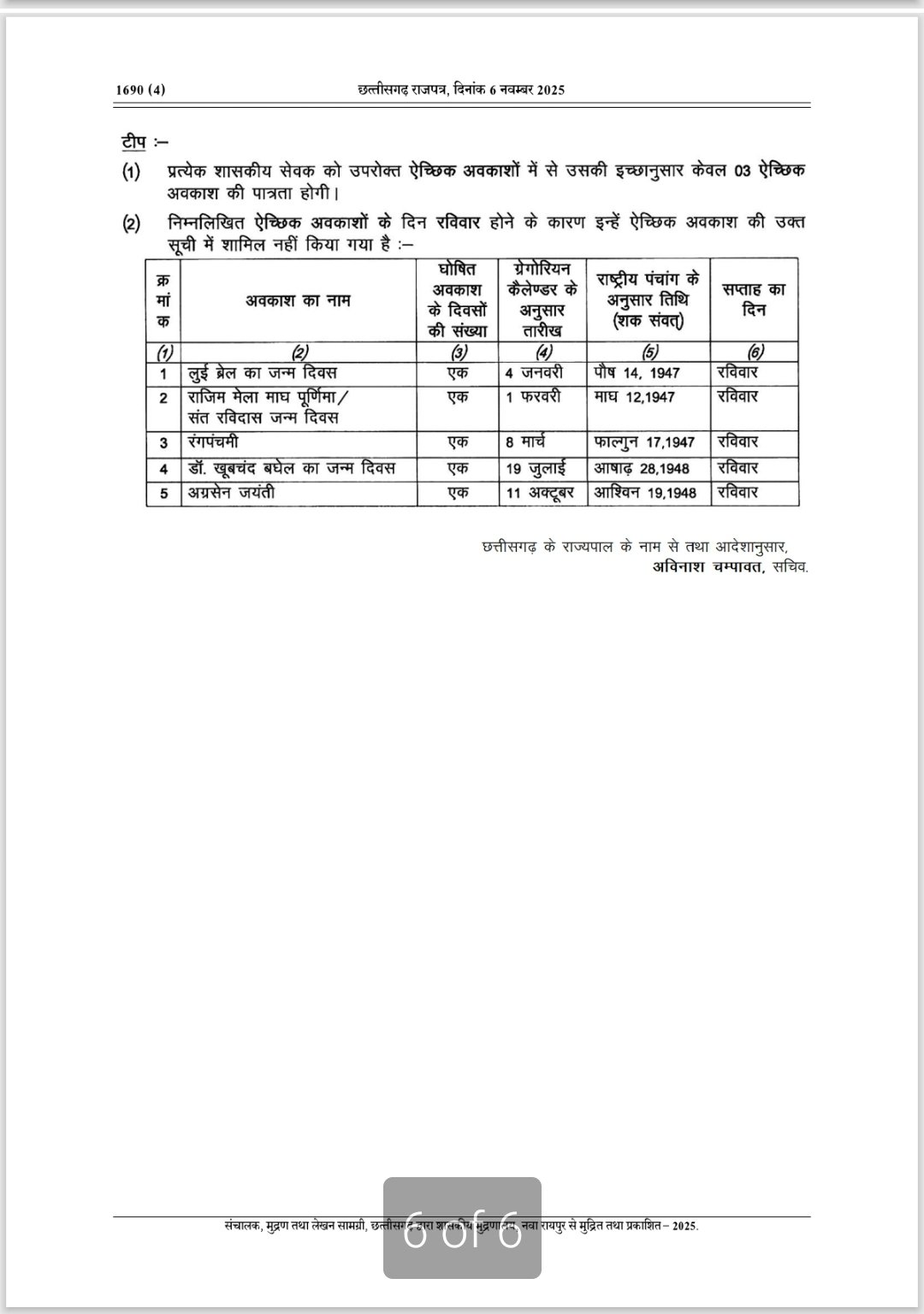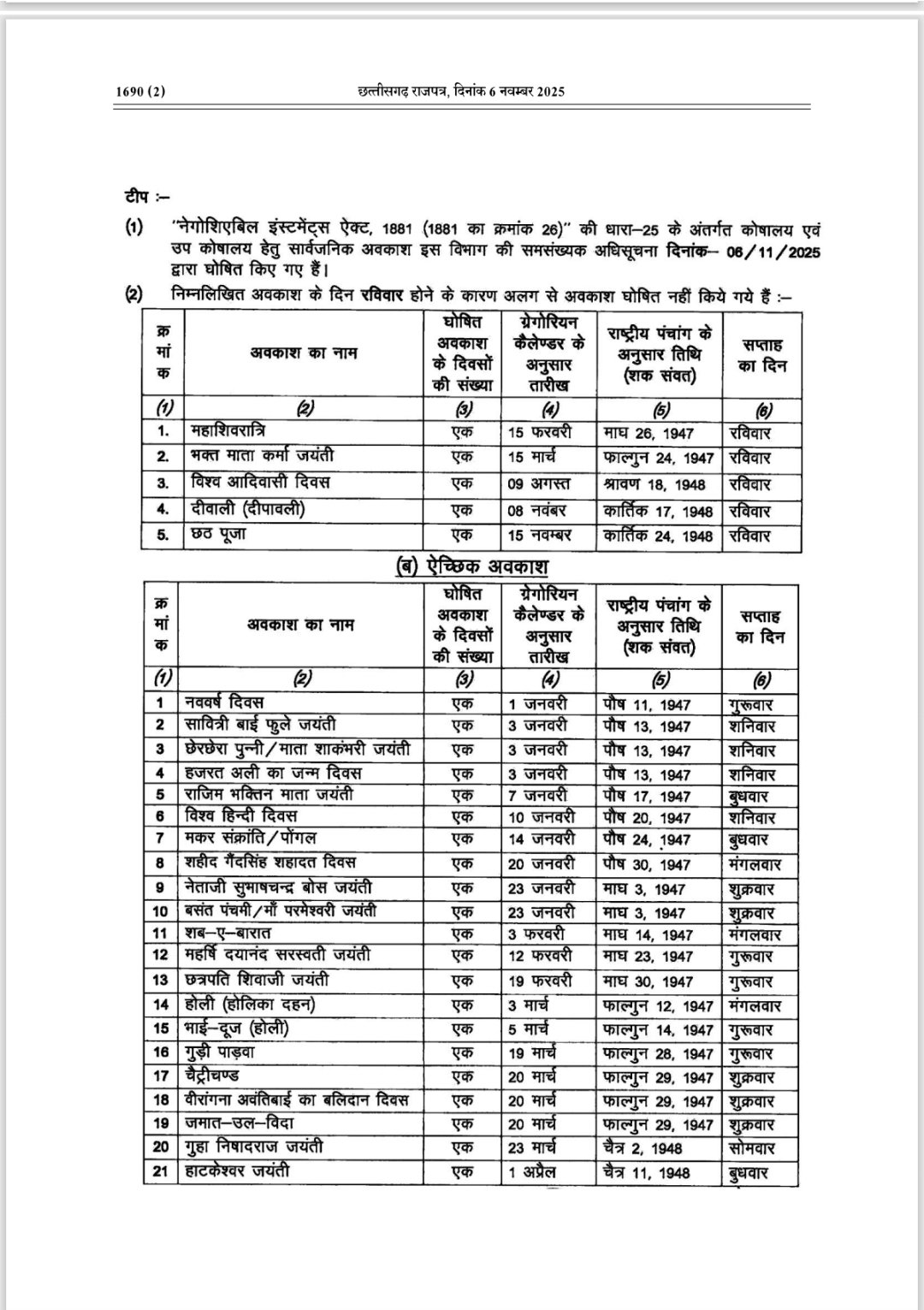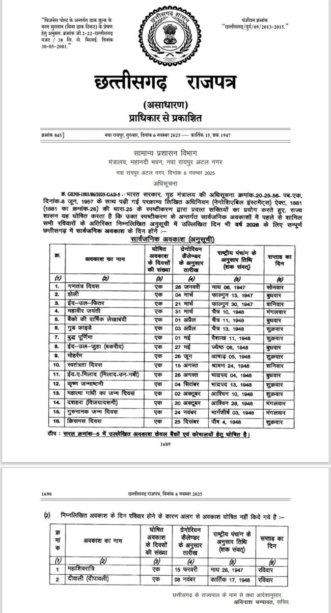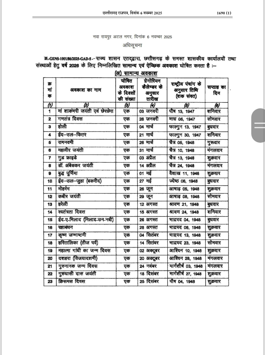 सीजी न्यूज़ ऑनलाइन, 07 नवंबर। सरकारी अमले के लिए नया साल भरमार छुट्टियों के साथ आ रहा है। राज्य शासन ने इन छुट्टियों को राजपत्र में प्रकाशित कर दिया है।