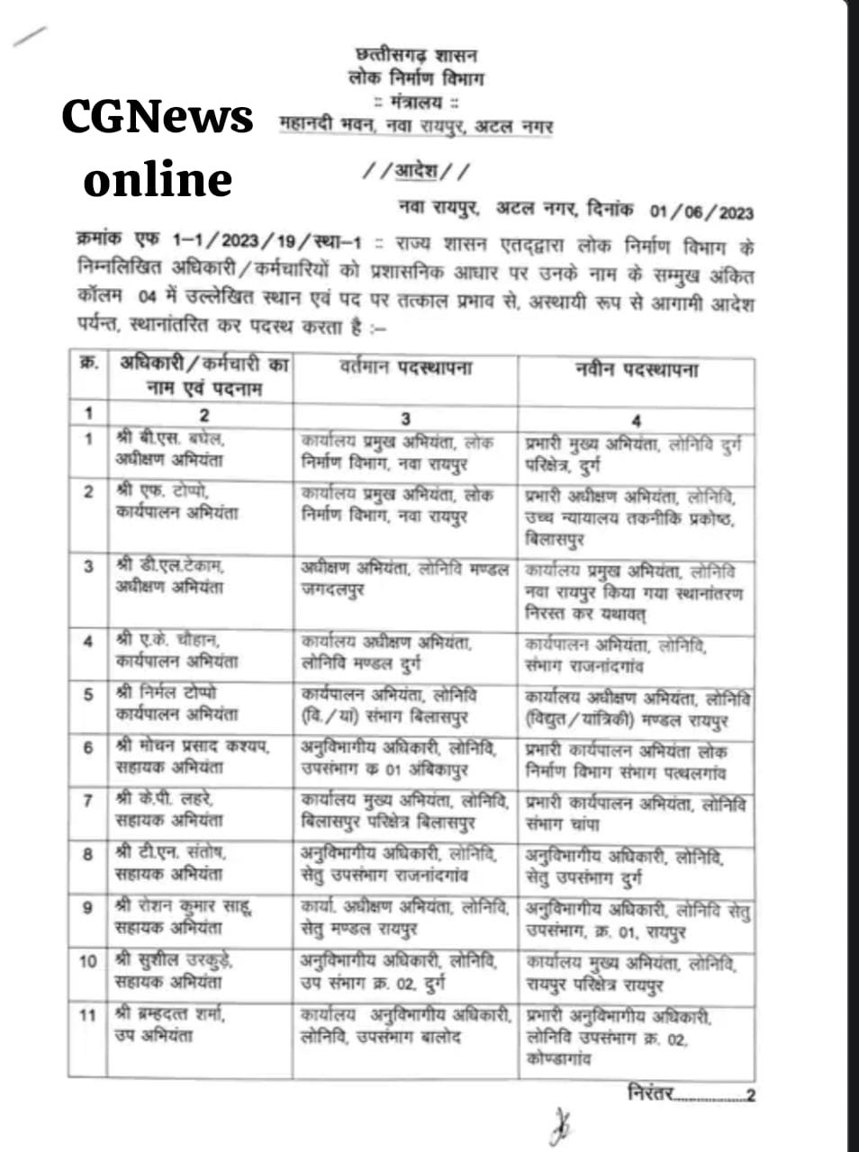 PWD के 21 अफसरों का हुआ ट्रांसफर 🟦 रायपुर, बिलासपुर, दुर्ग भेजे गए अधिक्षण-कार्यपालन अभियंता जैसे अधिकारी, आदेश जारी