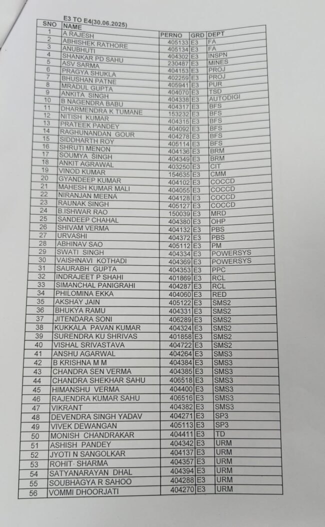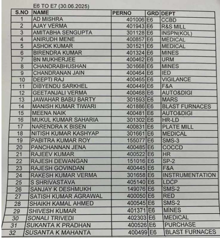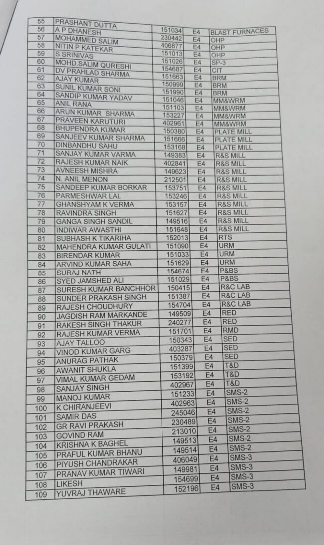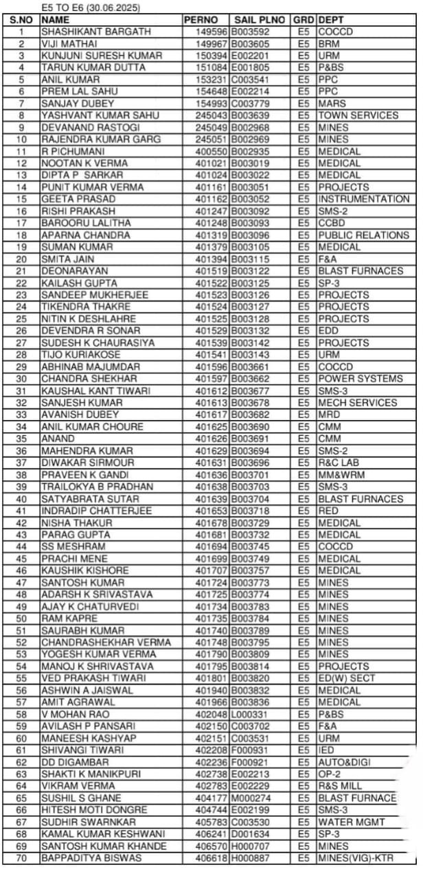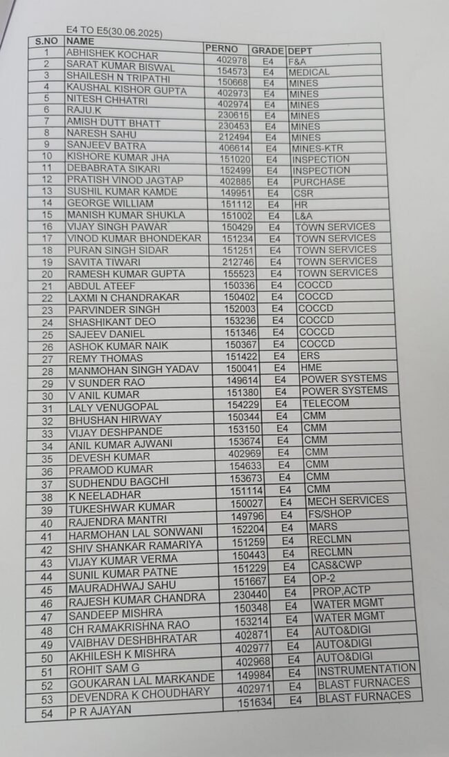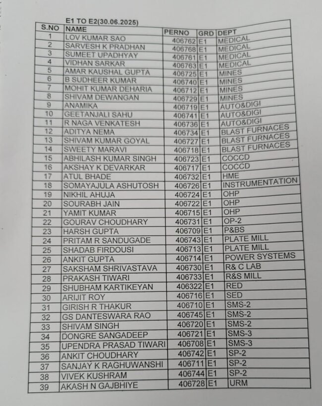 भिलाई नगर 30 जून। भिलाई इस्पात संयंत्र प्रबंधन के द्वारा आज E1 से लेकर E4 तक कुल 219 अधिकारियों को प्रमोशन दिया गया है। प्रबंधन के द्वारा पदोन्नति प्राप्त सभी अधिकारियों की सूची जारी कर दी गई है।