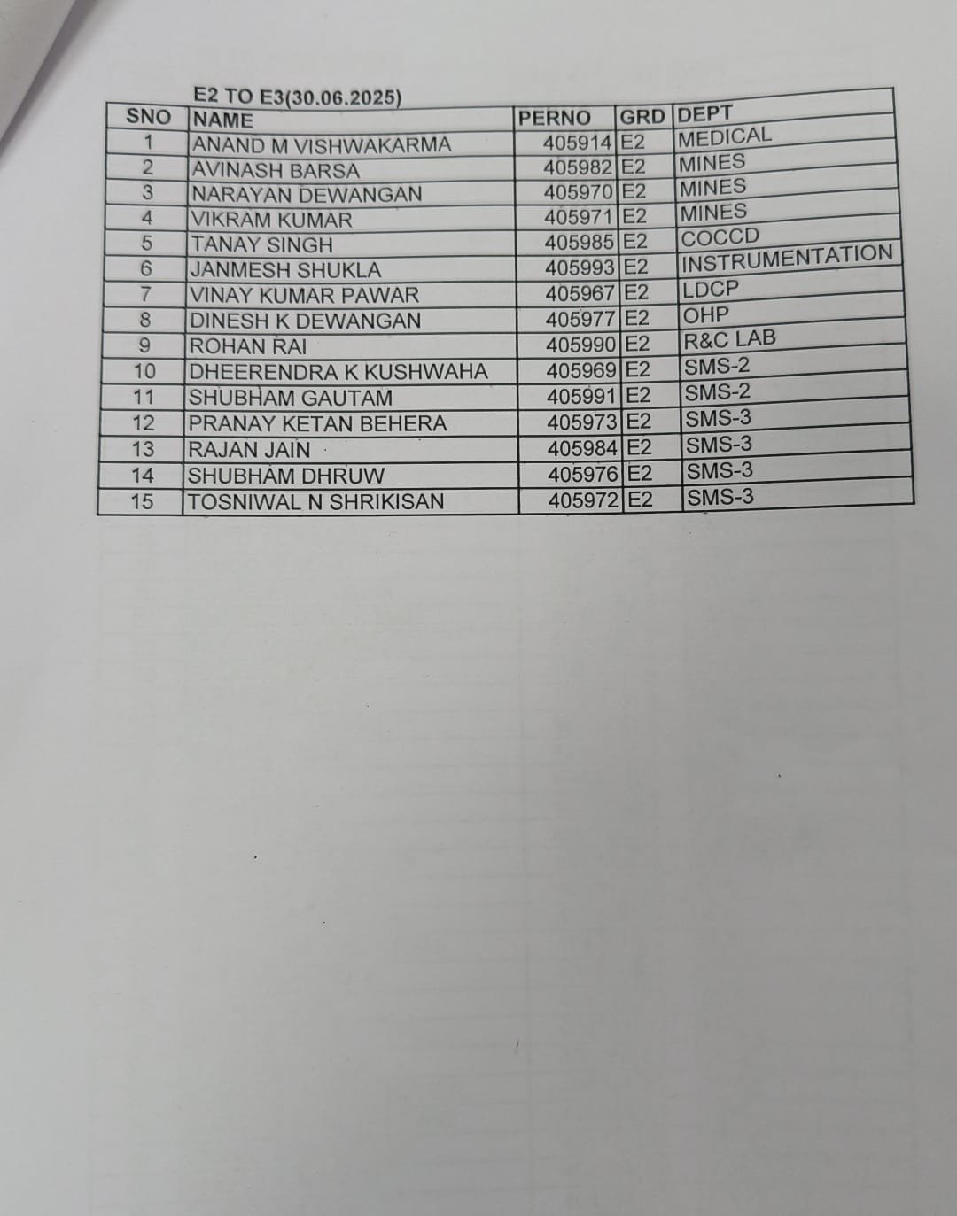जिसके तहत एवं 39 अधिकारियों को Ε1 से Ε 2, 15 अधिकारियों को Ε2 ΤΟ Ε3, 56 अधिकारियों को Ε3 ΤΟ Ε4 एवं 109 अधिकारियों को E4 TO E5 पद पर प्रमोशन प्राप्त हुआ है।