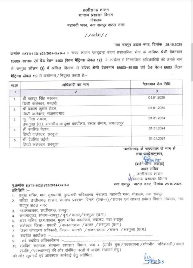 सीजी न्यूज ऑनलाइन, 30 अक्टूबर । राज्य शासन ने राज्य प्रशासनिक सेवा के 6 अधिकारियों को क्रमोन्नति दी है। इनमें टीआर अग्रवाल को वरिष्ठ प्रवर श्रेणी, पांच को कनिष्ठ से वरिष्ठ श्रेणी वेतनमान में क्रमोन्नत किया है। इनमें से एक को जनवरी 20 और 4 को जनवरी 24 से वेतनमान दिया जाएगा।