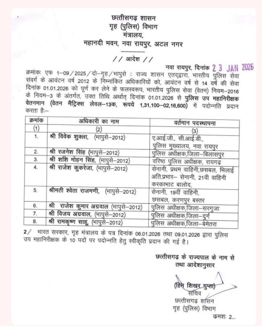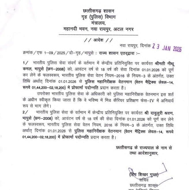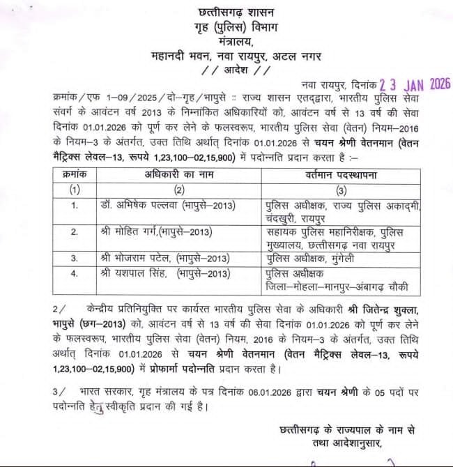 सीजी न्यूज ऑनलाइन, 23 जनवरी। भारतीय पुलिस सेवा के दर्जन भर अफसर प्रमोट हुए हैं। इस कड़ी में डा आनंद छाबड़ा एडीजी, प्रशांत अग्रवाल व मिलना कुर्रे आईजी बने हैं।