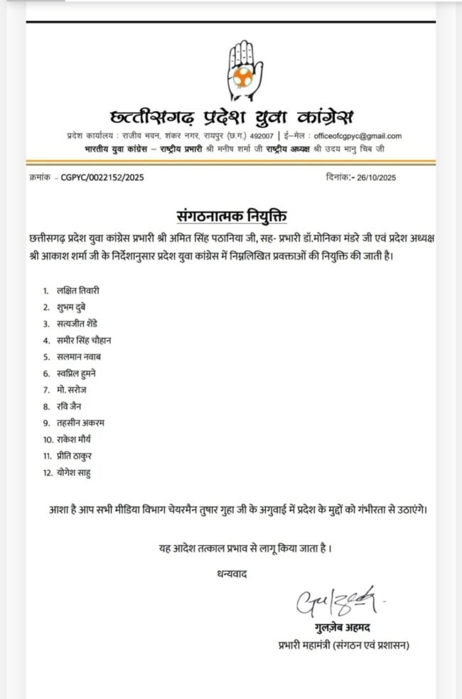 सीजी न्यूज ऑनलाइन, 26 अक्टूबर। छत्तीसगढ़ प्रदेश युवा कांग्रेस प्रभारी अमित सिंह पठानिया, सह- प्रभारी डॉ. मोनिका मंडरे एवं प्रदेश अध्यक्ष आकाश शर्मा के निर्देशानुसार प्रदेश युवा कांग्रेस में दर्जन भर प्रवक्ताओं की नियुक्ति की गई है। विधिवत आदेश जारी कर दिए गए हैं।