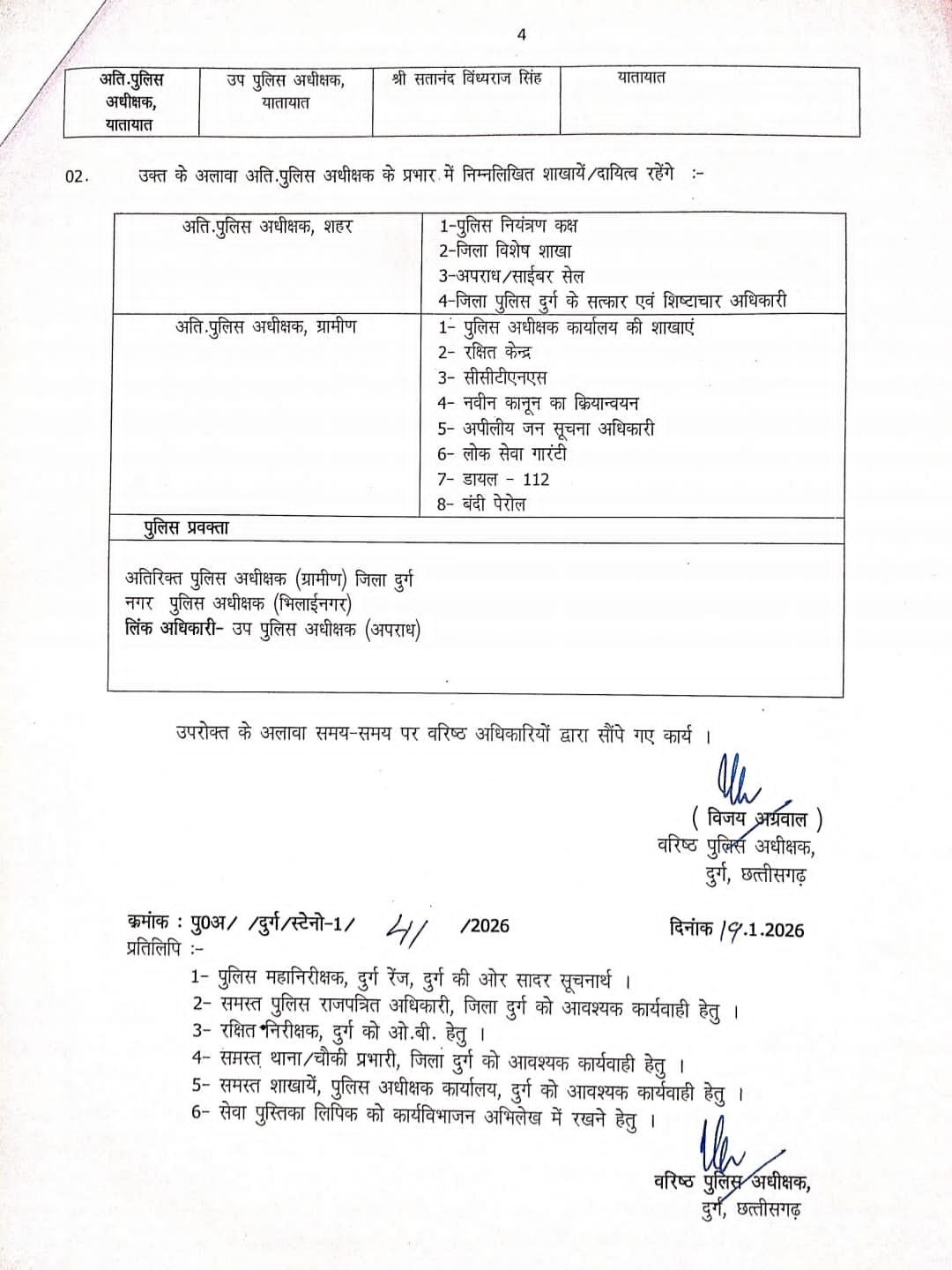 दुर्ग, 20 जनवरी 2026। वरिष्ठ पुलिस अधीक्षक दुर्ग विजय कुमार अग्रवाल द्वारा जिले में प्रभावी, पारदर्शी एवं सुव्यवस्थित पुलिसिंग सुनिश्चित करने के उद्देश्य से राजपत्रित एवं नवपदस्थ अधिकारियों के बीच कार्यों का स्पष्ट विभाजन किया गया है। इस व्यवस्था से जिले में कानून-व्यवस्था, अपराध नियंत्रण एवं प्रशासनिक कार्यों में और अधिक दक्षता आएगी।