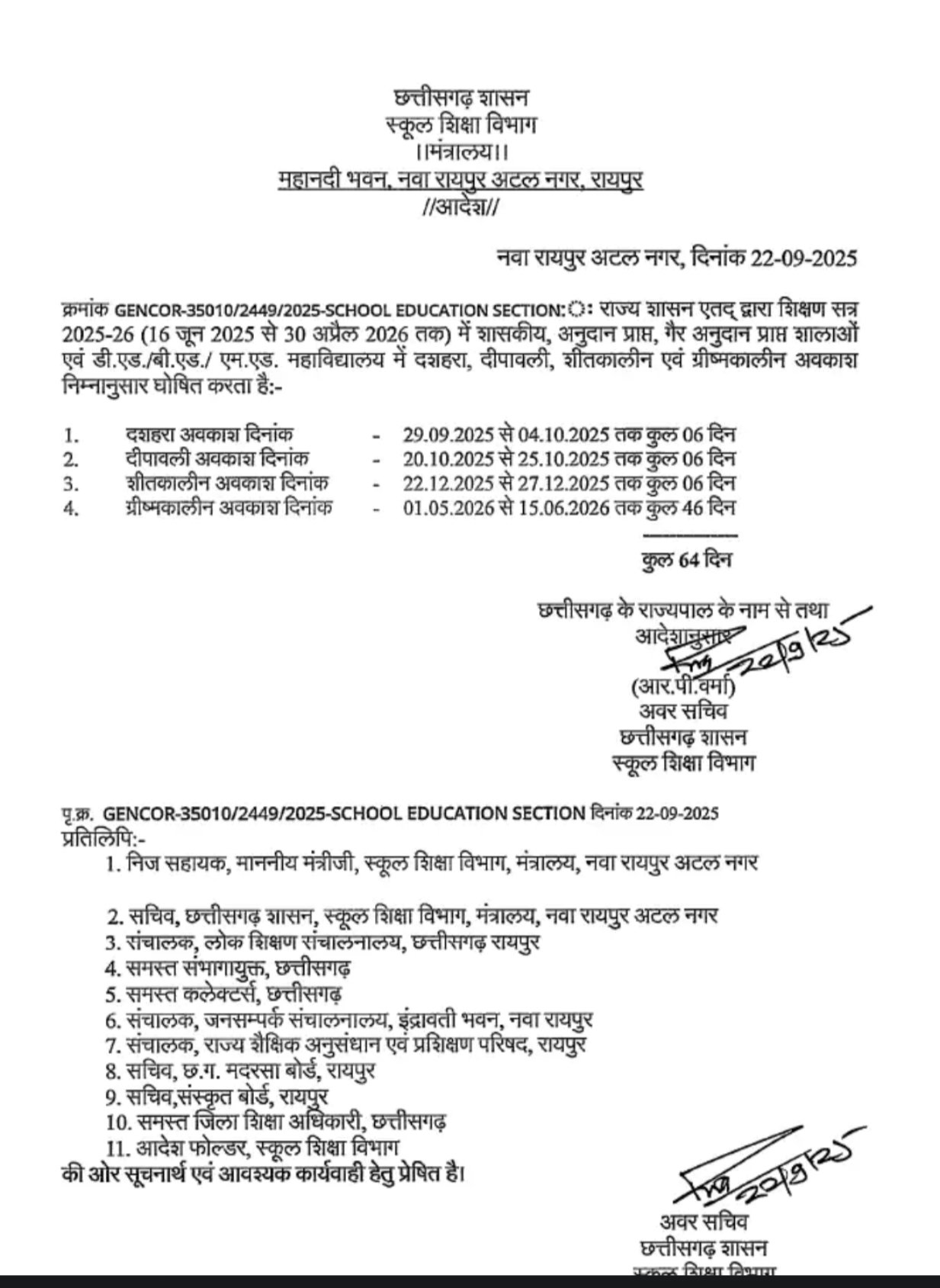 सीजी न्यूज ऑनलाइन 22 सितंबर। अगर आप भी सोच रहे हैं कि इस साल बच्चों की पढ़ाई के बीच कब-कब लंबा अवकाश मिलेगा, तो आपके लिए बड़ी खबर है। छत्तीसगढ़ शासन के स्कूल शिक्षा विभाग ने शैक्षणिक सत्र 2025-26 के लिए छुट्टियों का कैलेंडर जारी कर दिया है। इस बार बच्चों को पढ़ाई से ब्रेक के लिए कुल 64 दिन का अवकाश मिलने जा रहा है।