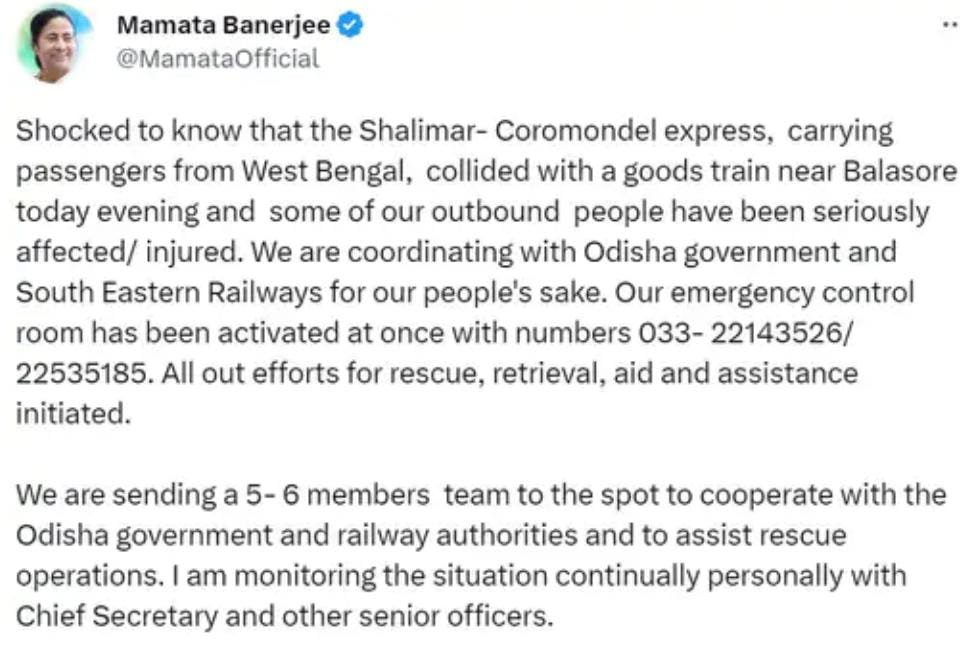 बालासोर रेलवे स्टेशन (BLS) से NDRF की 22 सदस्यों वाली पहली टीम पहले ही घटनास्थल पर पहुंच चुकी है। सेंट्रलाइज्ड ट्रैफिक कंट्रोल (CTC) की 32 सदस्यों वाली एक और टीम आधे घंटे पहले मौके के लिए रवाना हुई है। पश्चिम बंगाल की मुख्यमंत्री ममता बनर्जी ने हादसे पर दु:ख जताया है। उन्होंने ट्विटर पर लिखा कि बंगाल से यात्रियों को ले जा रही शालीमार- कोरोमंडल एक्सप्रेस आज शाम बालासोर के पास एक मालगाड़ी से टकरा गई। इससे कई लोगों के घायल होने की खबर है। हम ओडिशा सरकार के साथ और दक्षिण पूर्व रेलवे के साथ मिलकर काम कर रहे हैं। ओडिशा सरकार की मदद के लिए 5-6 सदस्यों की एक टीम मौके पर भेज रहे हैं। मैं मुख्य सचिव और अन्य सीनियर अधिकारियों से इस मुद्दे पर जानकारी ले रही हूं।