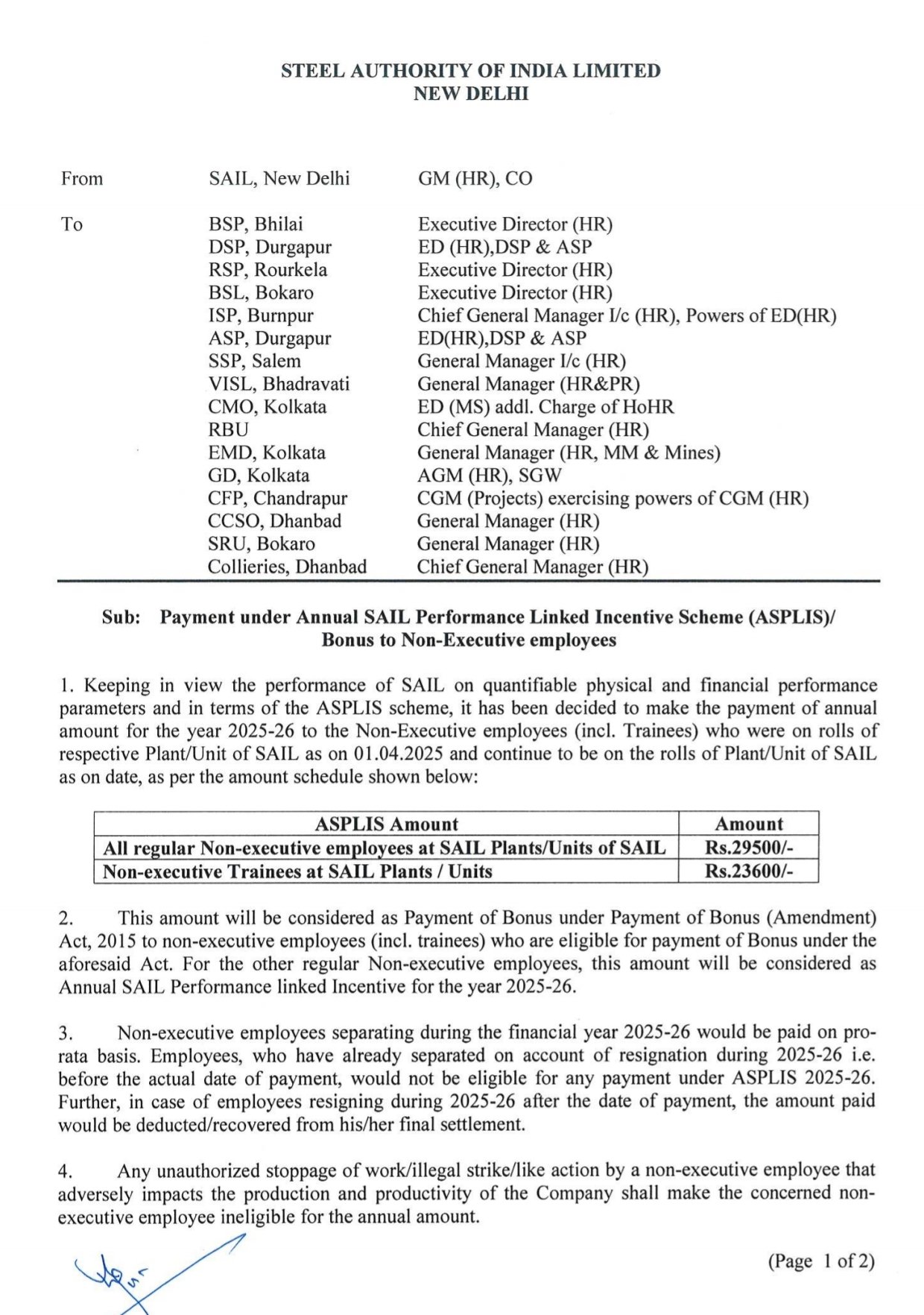 यह राशि भुगतान के अंतर्गत बोनस भुगतान मानी जाएगी। बोनस (संशोधन) अधिनियम, 2015 के तहत उन गैर-कार्यकारी कर्मचारियों (प्रशिक्षुओं सहित) को बोनस दिया जाएगा जो उपरोक्त अधिनियम के अंतर्गत बोनस भुगतान के पात्र हैं। अन्य नियमित गैर-कार्यकारी कर्मचारियों के लिए, यह राशि वर्ष 2025-26 के लिए वार्षिक सेल प्रदर्शन-आधारित प्रोत्साहन राशि मानी जाएगी।