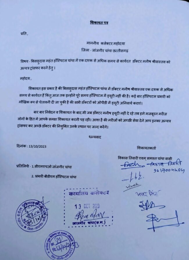 शिकायतकर्ताओं ने डॉ. मनीष श्रीवास्तव को चांपा से हटाने की मांग की थी, लेकिन