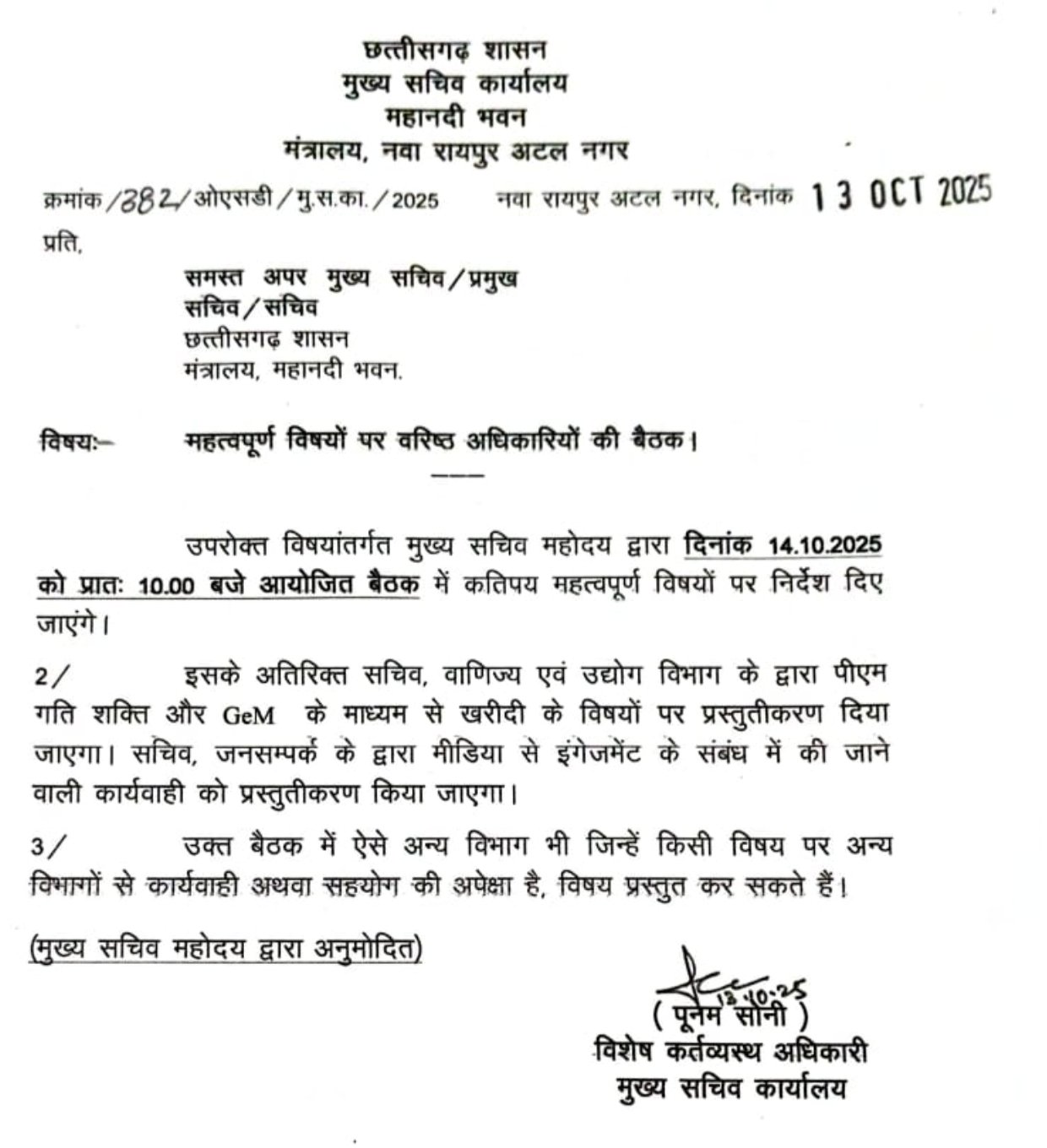 रायपुर, 13 अक्टूबर। सीएम के दो दिवसीय आल सेक्रेटरीज़ और कलेक्टर कांफ्रेंस के बाद मुख्य सचिव विकास शील ने कल मंगलवार सुबह 10 बजे को एक और उच्च स्तरीय बैठक बुलाई है। इसमें सभी एसीएस, पीएस, सचिव आमंत्रित किया है। इसमें सचिव वाणिज्य उद्योग पीएम गति शक्ति, जेम पोर्टल से खरीदी के विषय पर प्रजेंटेशन देंगे। सचिव जनसंपर्क मीडिया से इंगेजमेंट पर की जाने वाली कार्रवाई का प्रस्तुतीकरण किया जाएगा।