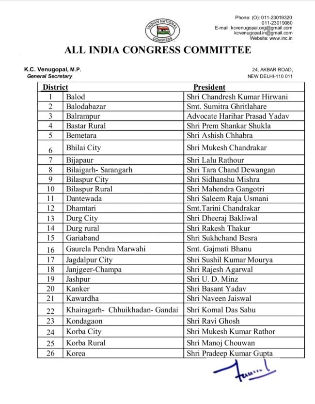 नव नियुक्त जिला अध्यक्षों की सूची इस प्रकार है –