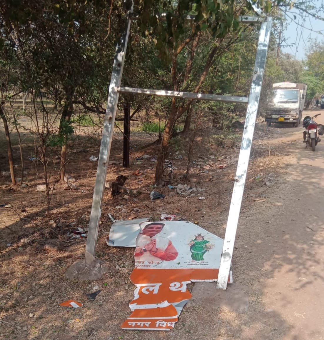 भिलाई नगर, 16 फरवरी 2026। वैशाली नगर विधानसभा क्षेत्र में आम नागरिकों की सुविधा के लिए लगाए गए मार्गदर्शक साइन बोर्डों में से एक जामुल थाना एप्रोच रोड पर क्षतिग्रस्त होकर पिछले एक सप्ताह से जमीन पर पड़ा है। विधायक रिकेश सेन द्वारा लगाए गए इस बोर्ड पर छत्तीसगढ़ महतारी एवं विधायक की तस्वीर होने के कारण इसे लेकर स्थानीय लोगों में नाराजगी है।
