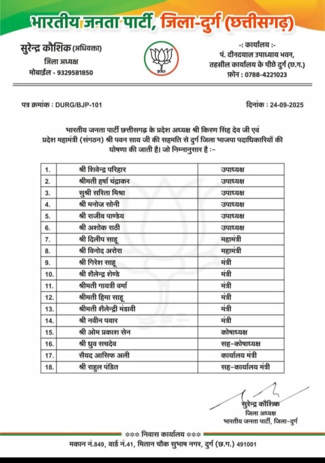 दुर्ग, 24 सितंबर। भारतीय जनता पार्टी छत्तीसगढ़ के प्रदेश अध्यक्ष किरण सिंह देव एवं प्रदेश महामंत्री (संगठन) पवन साय की सहमति से दुर्ग जिला भाजपा अध्यक्ष सुरेंद्र कौशिक के द्वारा पदाधिकारियों की घोषणा की गई है। इस कार्यकारणी में 6 उपाध्यक्ष दो महामंत्री एवं 6 मंत्री बनाए गए हैं। कार्यकारिणी की सूची जो निम्नानुसार है:-