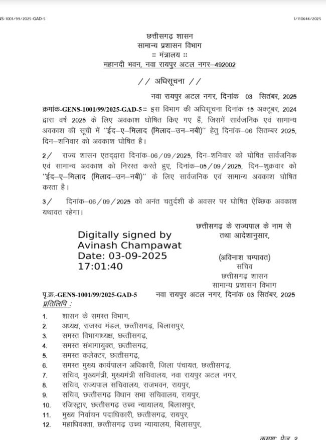 सीजी न्यूज ऑनलाइन, 03 सितंबर। सामान्य प्रशासन विभाग ने ईद-मिलादुन्नबी के मौके पर सार्वजनिक अवकाश में संशोधन किया है। यह अवकाश 6 सितंबर को घोषित किया गया था। परंतु अब 6 के बजाय 5 सितंबर को रहेगा। प्रदेश के सभी स्कूल और शासकीय दफ्तर बंद रहेंगे। 6 सितंबर को घोषित अनंत चतुर्दशी ऐच्छिक अवकाश और परिवर्तित रहते हुए यथावत रहेगा।