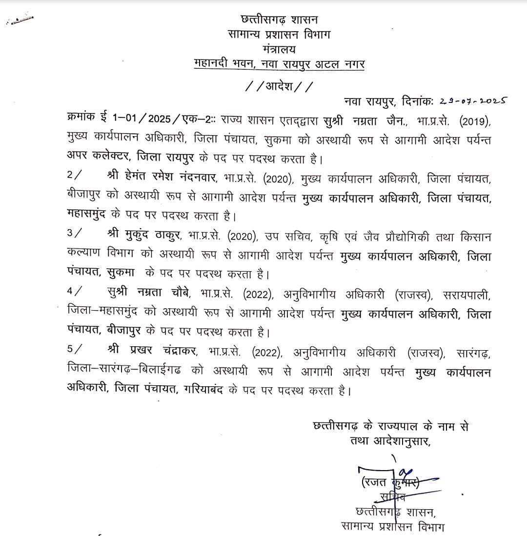 सीजी न्यूज ऑनलाइन 29 जुलाई। राज्य सरकार ने पांच भारतीय प्रशासनिक सेवा के 5 अफसरों के तबादले किए हैं। इनमें से 4 को जिला पंचायत सीईओ नियुक्त किया गया है। राज्य शासन द्वारा जारी आदेश इस प्रकार है।