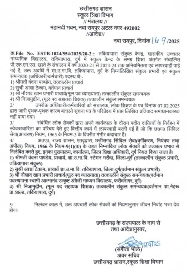इन लोक सेवकों को तत्काल प्रभाव से निलंबित करते हुए, इनका मुख्यालय, कार्यालय, जिला शिक्षा अधिकारी, दुर्ग नियत किया जाता है।