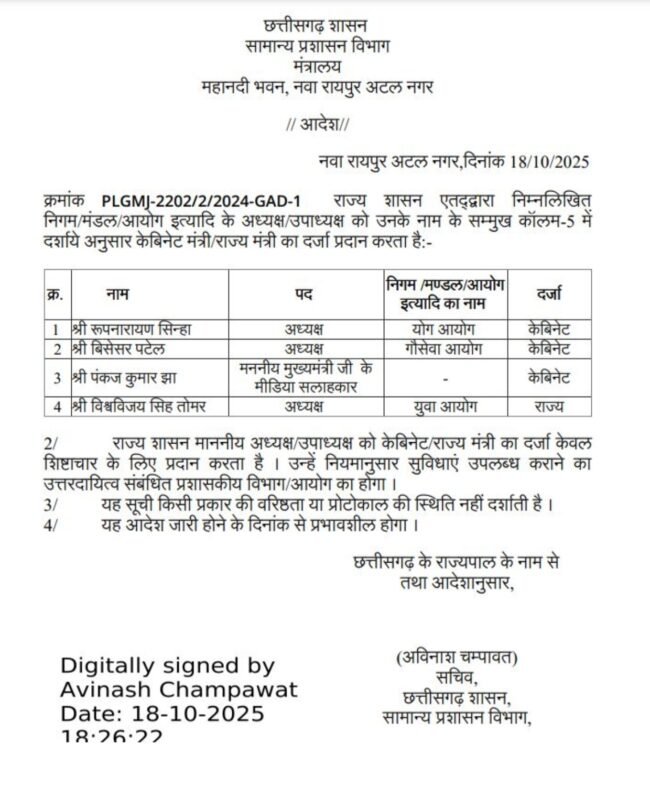 सीजी न्यूज ऑनलाइन, 18 अक्टूबर। सरकार ने सीएम के मीडिया सलाहकार पंकज कुमार झा, और योग आयोग के अध्यक्ष रूपनारायण सिन्हा, गौ सेवा आयोग के अध्यक्ष विश्वेश्वर पटेल को कैबिनेट का दर्जा एवं युवा आयोग के अध्यक्ष विश्वजीत पटेल को राज्य मंत्री का दर्जा दिया है। इस आशय के आदेश जारी कर दिए गए हैं।