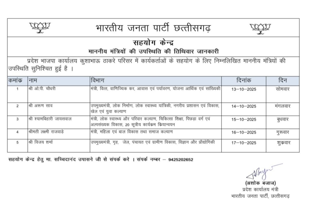 केंद्र के प्रभारी सच्चिदानंद उपासने ने बताया कि वित्त मंत्री ओ.पी. चौधरी 13 अक्टूबर, उपमुख्यमंत्री अरुण साव 14 को स्वास्थ्य मंत्री जायसवाल 15 को, महिला एवं बाल विकास मंत्री श्रीमती लक्ष्मी राजवाड़े 16 को व उपमुख्यमंत्री विजय शर्मा 17 अक्टूबर को उपलब्ध रहेंगे। यह सभी मंत्री भाजपा कार्यकर्ताओं की समस्याओं को सुनेंगे।