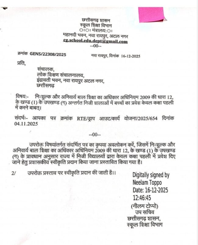 सीजी न्यूज ऑनलाइन, 16 दिसंबर। अब प्रदेश के निजी स्कूलों में आरटीई में प्रवेश केवल कक्षा 1 में ही मिल सकेगा। इस संबंध में डीपीआई के 4 नवंबर के प्रस्ताव पर स्कूल शिक्षा विभाग ने मंजूरी दे दी है। उप सचिव नीलम टोप्पो ने डीपीआई को भेजे आदेश में कहा कि आरटीई की धारा 12 1 ग में संशोधन किया गया है। इसके मुताबिक राज्य में निजी विद्यालयों द्वारा कक्षा पहली में प्रवेश की मांग की थी। इस प्रस्ताव को स्वीकृति दी गई है।