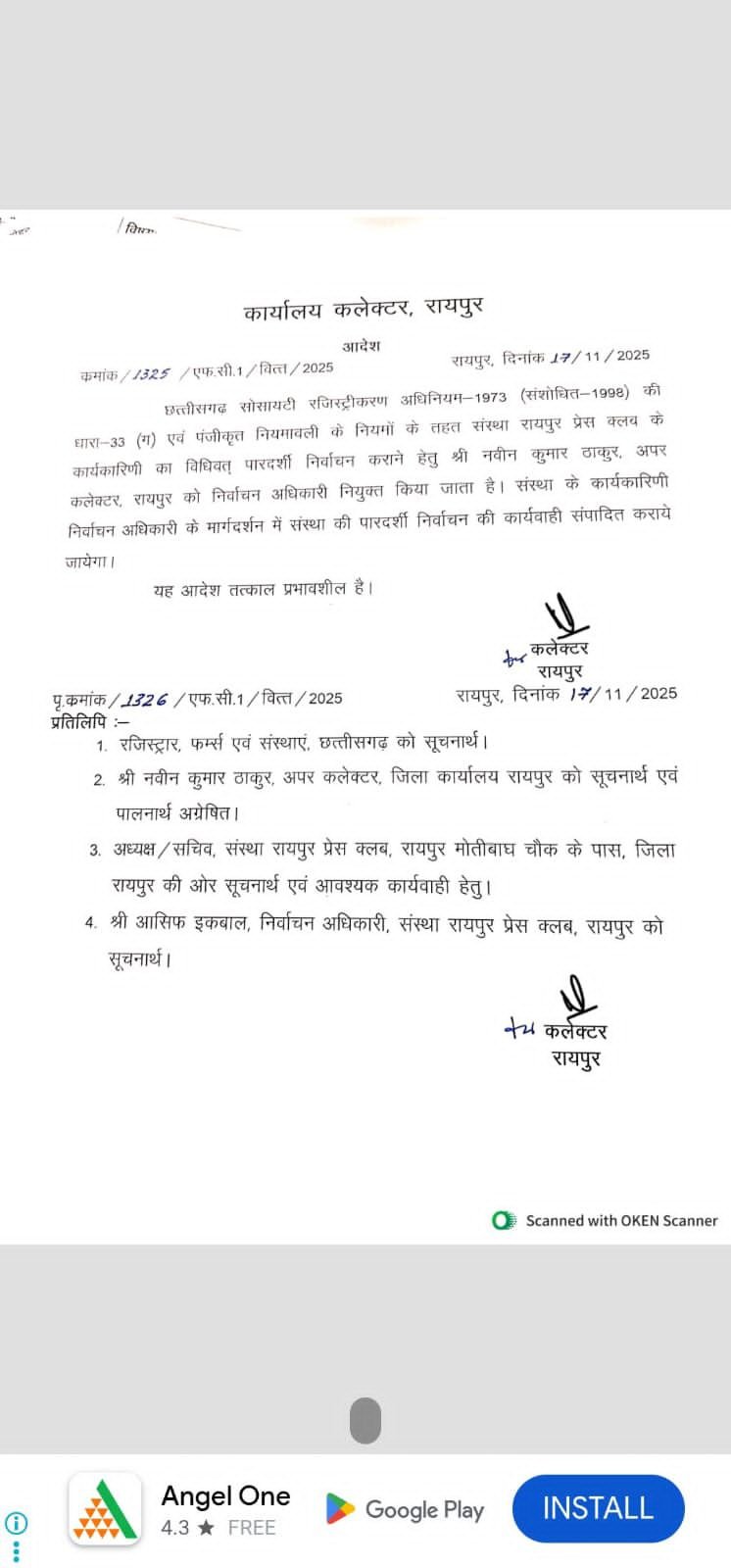 जानकारी के मुताबिक, रायपुर प्रेस क्लब की मौजूदा कार्यकरणीय को दरकिनार करते हुए कलेक्टर रायपुर द्वारा नामित प्रशासनिक अधिकारी को बतौर प्रशासक प्रेस क्लब की जिम्मेदारी सौंपे जाने का फरमान जारी किया गया है। आदेश में इसका स्पष्ट उल्लेख भी किया गया है। फिलहाल, नए आदेश के सामने आने के बाद प्रेस क्लब के पुराने पदाधिकारियों के पैरों तले जमीन खिसक गई है। सूत्र यह भी तस्दीक करते है, कि प्रेस क्लब की आड़ में धन उगाही और अपराधिक गतियों को लेकर कई पदाधिकारियों के खिलाफ जल्द ही FIR भी दर्ज हो सकती है ।