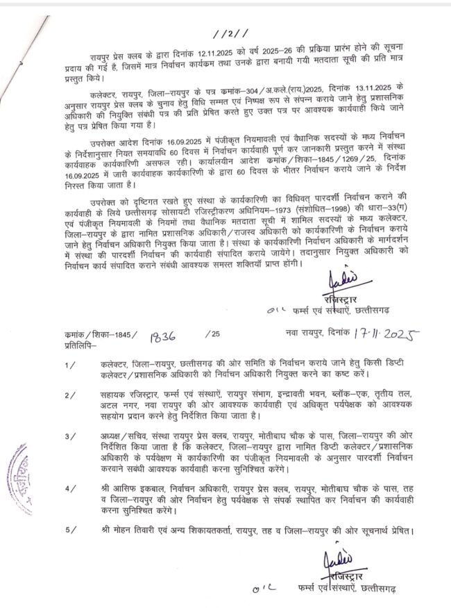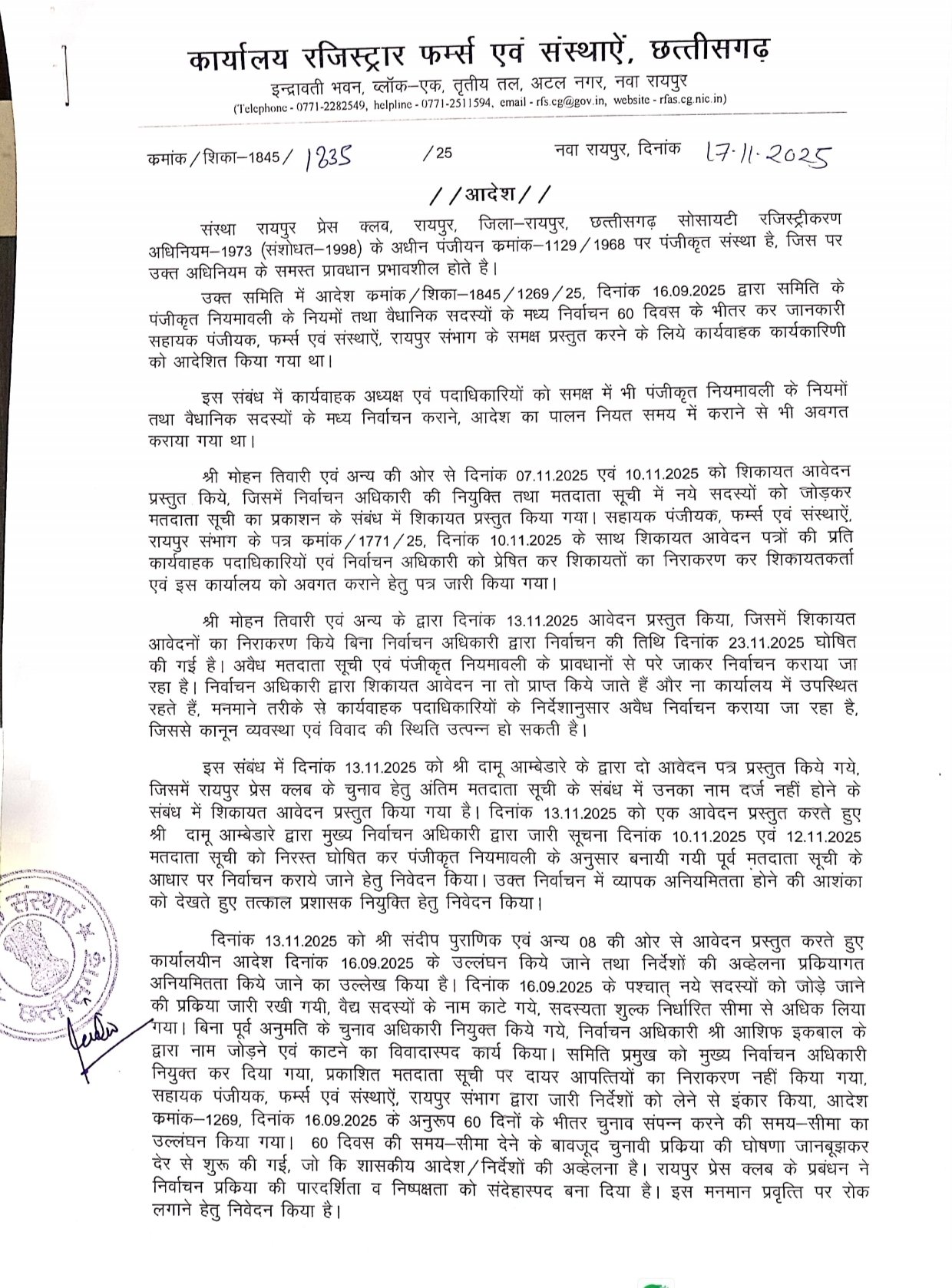 रायपुर, 17 नवम्बर। रायपुर प्रेस क्लब चुनाव स्थगित हो गया है। वर्तमान में प्रेस क्लब के स्वयंभू पदाधिकारियों ने एक तरफा चुनाव का ऐलान कर दिया था। इस चुनाव में धांधली बरते जाने की आशंका के बीच कार्यालय रजिस्ट्रार फर्म्स एवं संस्थाएँ छत्तीसगढ़ ने चुनावी प्रकिया पर ही विराम लगा दिया है। बताया जाता है, कि मौजूदा पदाधिकारियों ने दोबारा प्रेस क्लब में काबिज़ होने के लिए कई गैर कानून हथकंडे अपनाए थे। इसकी शिकायत कई पत्रकारों ने राज्य सरकार और कार्यालय रजिस्ट्रार फर्म्स एवं संस्थाएँ से की थी।