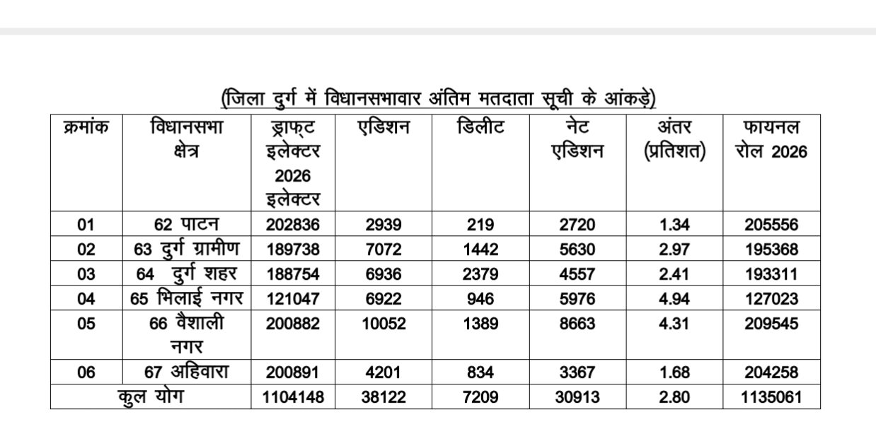 चार महीने तक चली निरंतर प्रक्रिया के बाद, 01.01.2026 की अर्हता तिथि के आधार पर आज 21 फरवरी 2026 को जिला दुर्ग के सभी मतदान केंद्रों सहित प्रत्येक निर्धारित स्थानों पर अंतिम मतदाता सूची प्रकाशित कर दी गई है।