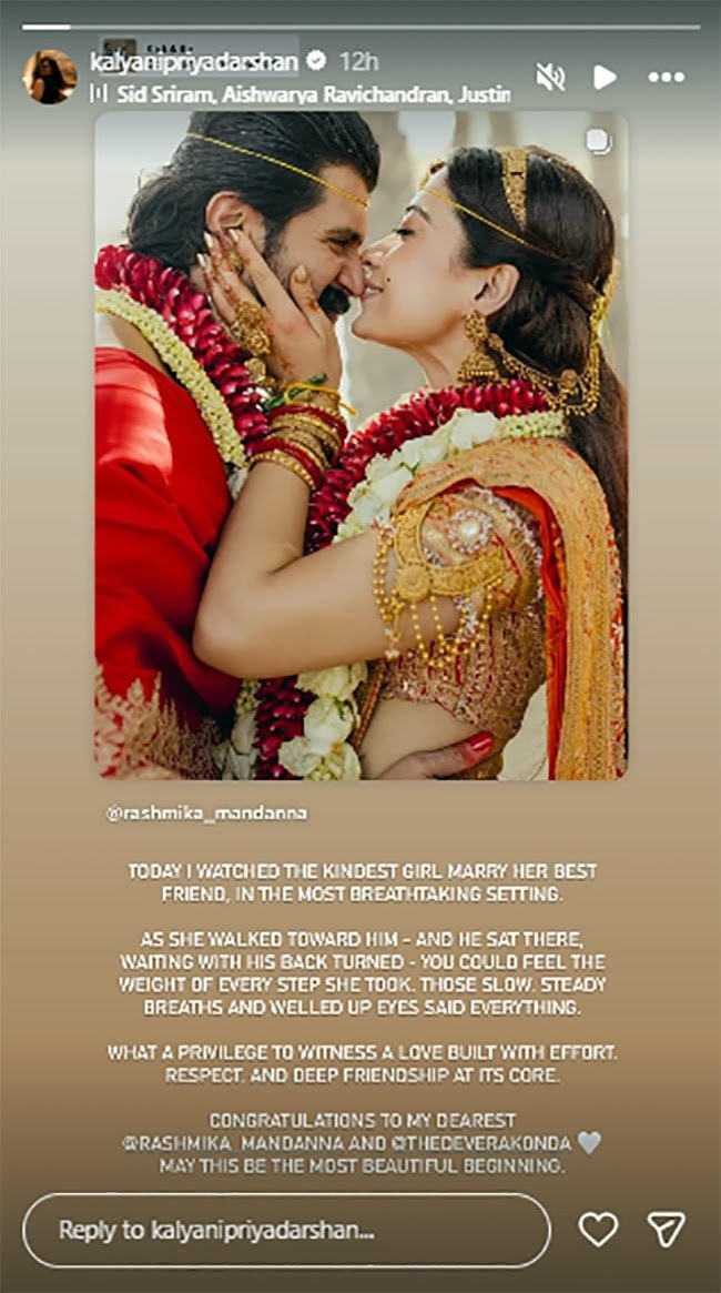 रश्मिका मंदाना और विजय देवरकोंडा सालों तक डेट करने के बाद पति-पत्नी बन गए है. उन्होंने 26 फरवरी को कोडावा और आंध्रा रीति रिवाजों से शादी की. इंटरनेट कपल की ड्रीमी वेडिंग फोटोज से भरा हुआ है. हर कोई उनकी ट्रैडिशनल और सिंपल वेडिंग की बात कर रहा है. लोका स्टार कल्याणी प्रियदर्शन उन चुनिंदा लोगों में शामिल रहीं, जिन्होंने विजय-रश्मिका की इंटीमेट वेडिंग अटेंड की.