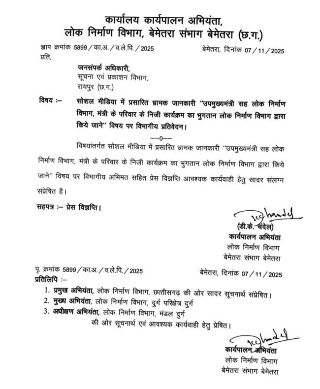 सीजी न्यूज़ ऑनलाइन. 08 नवम्बर. कतिपय सोशल मीडिया में प्रसारित उप मुख्यमंत्री-सह-लोक निर्माण मंत्री के परिवार के निजी कार्यक्रम का भुगतान लोक निर्माण विभाग द्वारा किये जाने संबंधी समाचार तथ्यहीन एवं भ्रामक है। लोक निर्माण विभाग द्वारा उप मुख्यमंत्री श्री अरुण साव या किसी भी निजी कार्यक्रम का कोई भुगतान नहीं किया गया है। आरटीआई के तहत विभाग द्वारा प्रदान की गई जानकारी में सोशल मीडिया में प्रसारित किसी भी बिल का कोई उल्लेख नहीं है। इन बिलों से विभाग का कोई संबंध नहीं है। लोक निर्माण विभाग के बेमेतरा संभाग के कार्यपालन अभियंता डी.के. चंदेल ने इस संबंध में वस्तुस्थिति की विस्तार से जानकारी दी है।