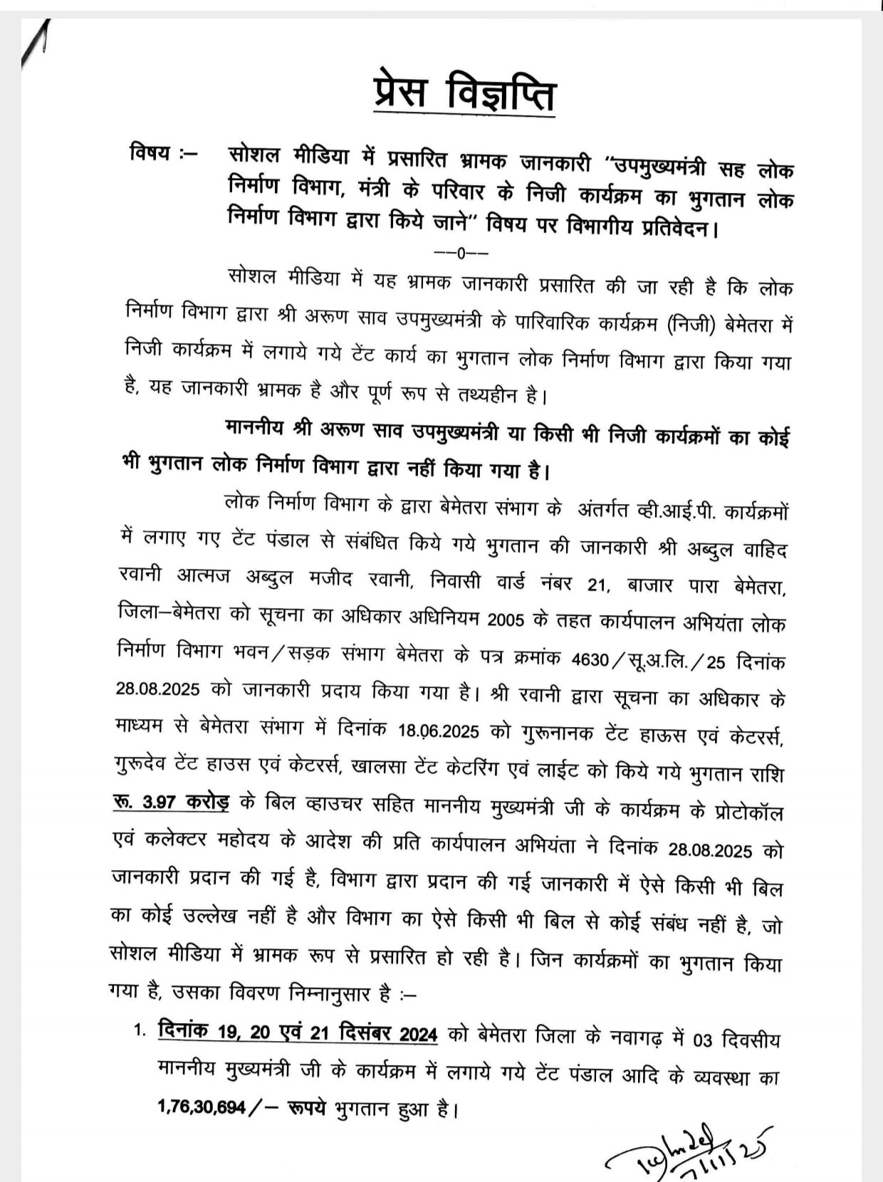श्री चंदेल ने बताया कि लोक निर्माण विभाग के बेमेतरा संभाग के अंतर्गत व्ही.आई.पी. कार्यक्रमों में लगाए गए टेंट-पंडाल से संबंधित किये गये भुगतान की जानकारी श्री अब्दुल वाहिद रवानी आत्मज अब्दुल मजीद रवानी, निवासी वार्ड नंबर 21, बाजार पारा बेमेतरा, जिला-बेमेतरा को सूचना का अधिकार अधिनियम, 2005 के तहत कार्यपालन अभियंता, लोक निर्माण विभाग भवन/सड़क, संभाग बेमेतरा के पत्र क्रमांक 4630/सू.अ.लि./25, दिनांक 28.08.2025 को जानकारी प्रदान किया गया है। श्री रवानी द्वारा सूचना का अधिकार के माध्यम से बेमेतरा संभाग में दिनांक 18.06.2025 को गुरूनानक टेंट हाऊस एवं केटरर्स, गुरूदेव टेंट हाउस एवं केटरर्स, खालसा टेंट केटरिंग एवं लाइट को किये गये भुगतान राशि रू. 3.97 करोड़ के बिल व्हाउचर सहित मुख्यमंत्री के कार्यक्रम के प्रोटोकॉल एवं कलेक्टर महोदय के आदेश की प्रति कार्यपालन अभियंता ने दिनांक 28.08.2025 को जानकारी प्रदान की है। विभाग द्वारा प्रदान की गई जानकारी में ऐसे किसी भी बिल का कोई उल्लेख नहीं है और विभाग का ऐसे किसी भी बिल से कोई संबंध नहीं है, जो सोशल मीडिया में भ्रामक रूप से प्रसारित हो रही है। जिन कार्यक्रमों का भुगतान किया गया है, उसका विवरण निम्नानुसार है –