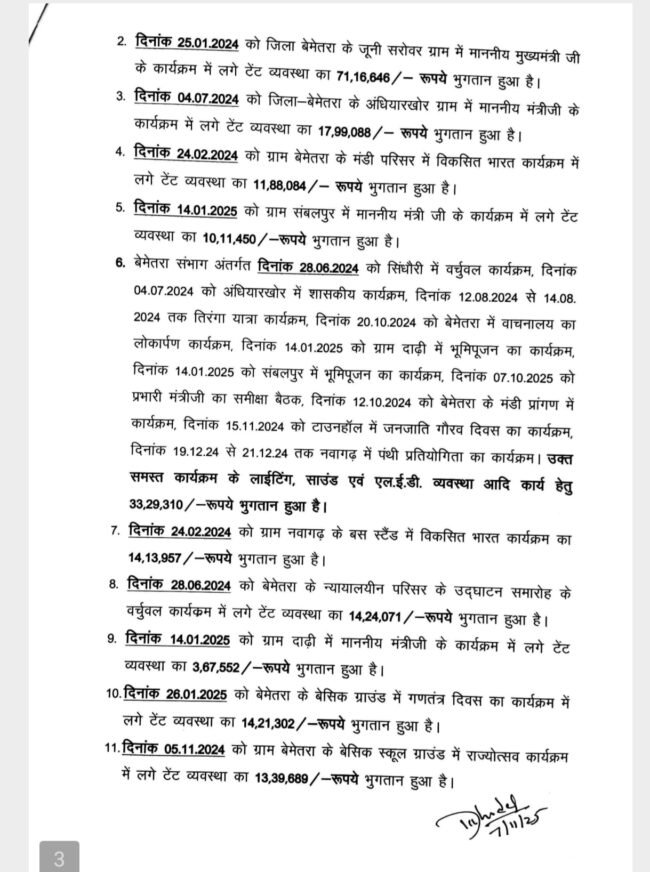 - बेमेतरा संभाग अंतर्गत दिनांक 28.06.2024 को सिंधौरी में वर्चुअल कार्यक्रम, दिनांक 04.07.2024 को अंधियारखोर में शासकीय कार्यक्रम, दिनांक 12.08.2024 से 14.08. 2024 तक तिरंगा यात्रा कार्यक्रम, दिनांक 20.10.2024 को बेमेतरा में वाचनालय का लोकार्पण कार्यक्रम, दिनांक 14.01.2025 को ग्राम दाढ़ी में भूमिपूजन का कार्यक्रम, दिनांक 14.01.2025 को संबलपुर में भूमिपूजन का कार्यक्रम, दिनांक 07.10.2025 को प्रभारी मंत्री की समीक्षा बैठक, दिनांक 12.10.2024 को बेमेतरा के मंडी प्रांगण में कार्यक्रम, दिनांक 15.11.2024 को टाउन हॉल में जनजाति गौरव दिवस का कार्यक्रम, दिनांक 19.12.24 से 21.12.24 तक नवागढ़ में पंथी प्रतियोगिता के कार्यक्रम हुए हैं। इन सभी कार्यक्रमों में लाइटिंग, साउंड एवं एल.ई.डी. व्यवस्था आदि कार्य हेतु 33,29,310/- रूपये भुगतान हुआ है।