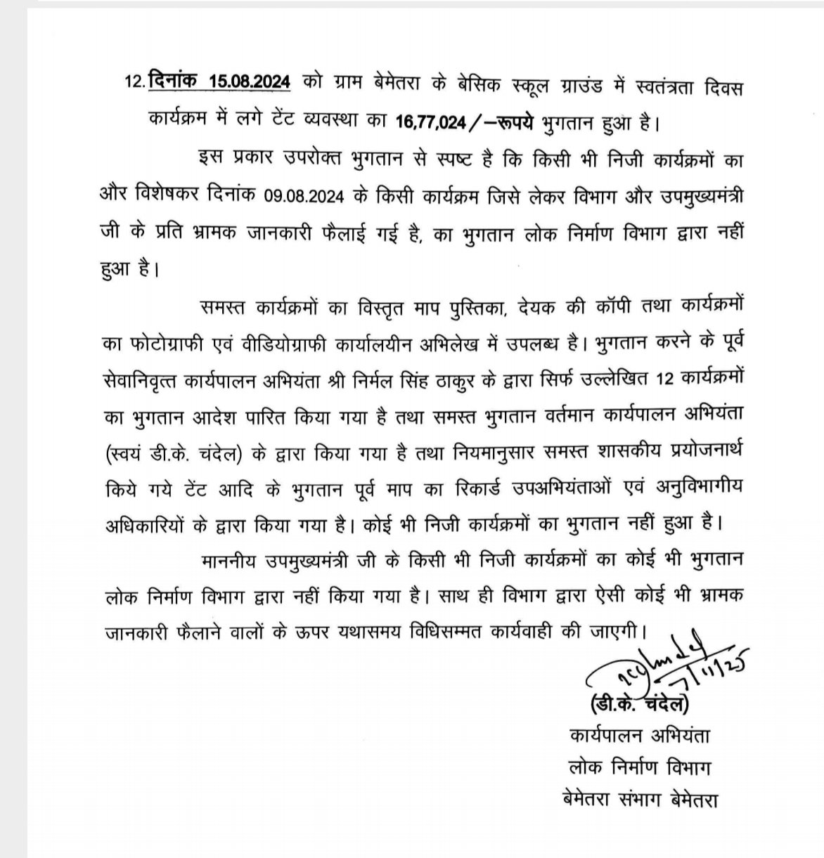 समस्त कार्यक्रमों का विस्तृत माप पुस्तिका, देयक की कॉपी तथा कार्यक्रमों की फोटोग्राफी एवं वीडियोग्राफी कार्यालयीन अभिलेख में उपलब्ध है। भुगतान करने के पूर्व सेवानिवृत्त कार्यपालन अभियंता श्री निर्मल सिंह ठाकुर के द्वारा सिर्फ ऊपर उल्लेखित 12 कार्यक्रमों का भुगतान आदेश पारित किया गया है तथा समस्त भुगतान वर्तमान कार्यपालन अभियंता (श्री डी.के. चंदेल) के द्वारा किया गया है तथा नियमानुसार समस्त शासकीय प्रयोजनार्थ किये गये टेंट आदि के भुगतान पूर्व माप का रिकार्ड उप अभियंताओं एवं अनुविभागीय अधिकारियों के द्वारा किया गया है। किसी भी निजी कार्यक्रम के लिए कोई भुगतान नहीं हुआ है।