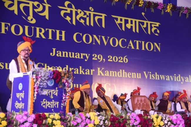 दुर्ग, 29 जनवरी 2026। दाऊ श्री वासुदेव चन्द्राकर कामधेनु विश्वविद्यालय, दुर्ग का चतुर्थ दीक्षांत समारोह आज विश्वविद्यालय परिसर में छत्तीसगढ़ के राज्यपाल श्री रमेन डेका की गरिमामयी उपस्थिति में संपन्न हुआ। समारोह में पशुचिकित्सा एवं पशुपालन, दुग्ध प्रौद्योगिकी एवं मात्स्यिकी संकाय के 1536 विद्यार्थियों को स्नातक, स्नातकोत्तर एवं पीएचडी उपाधियां प्रदान की गईं।