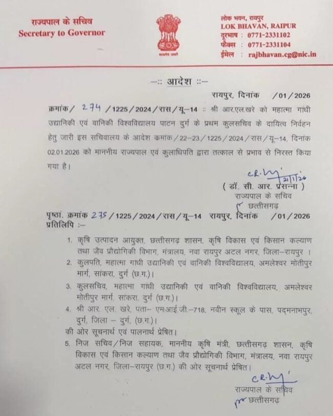 सीजी न्यूज ऑनलाइन, 22 जनवरी । राज्यपाल एवं कुलाधिपति रमेन डेका के आदेश पर महात्मा गांधी उद्यानिकी एवं वानिकी विश्वविद्यालय, पाटन (दुर्ग) के कुलसचिव आर.एल. खरे को उनके दायित्व से तत्काल प्रभाव से मुक्त कर दिया गया है।
