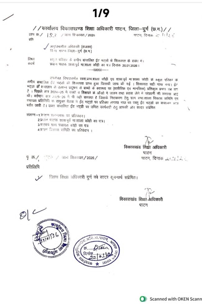 शास.प्राथ.शाला कौही एवं शास पूर्व मा शाला कौही के स्कूल परिसर के समीप संचालित ईट भट्ठों की शिकायत प्राप्त हुआ। जिसकी जाच की गई। शिकायत सही पाया गया। ईट भट्ठा के संचालन से उत्पन्न प्रदूषण से बच्चों के स्वास्थ्य पर (शारीरिक एवं मानसिक) प्रतिकूल प्रभाव पड़ रहा है। पिछले सत्र 2024-25 में बच्चों व शिक्षको के आँखो मे जलन तथा स्वास लेने में परेशानी की समस्या आई थी। वर्तमान सत्र 2025-26 में भी यही समस्या है जिसके निराकरण हेतु ग्राम सभा शाला विकास समिति ग्राम पंचायत प्रतिनिधि के संयुक्त बैठक में ईंट भट्ठों पर प्रतिबंध लगाया गया था। परतु ईंट भट्ठों का संचालन आज पर्यंत जारी है। जिसके कारण एसडीएम पाटन को 22 जनवरी 2026 को बीईओ पाटन के द्वारा पत्र भेजा गया परंतु एसडीएम की ओर से अभी तक कोई कार्यवाही नहीं की गई है।