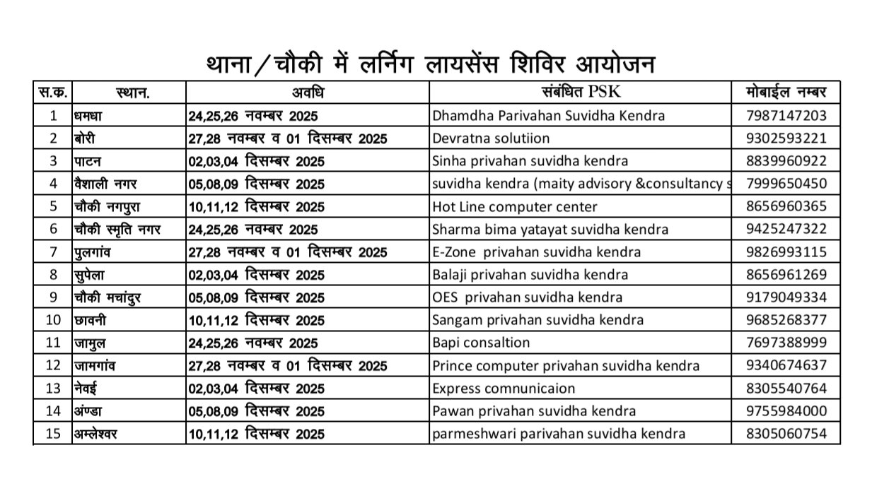 दुर्ग, 18 नवंबर। वरिष्ठ पुलिस अधीक्षक, दुर्ग के निर्देशानुसार यातायात पुलिस दुर्ग के द्वारा विशेष ड्राइविंग लाइसेंस शिविर का आयोजन किया गया है। यह शिविर 24 नवंबर 2025 से 12 दिसंबर 2025 तक दुर्ग जिले के 15 स्थान पर शिविर लगाए जाएंगे। जिले के विभिन्न क्षेत्रों में नागरिकों की सुविधा के लिए 18 दिवसीय विशेष अभियान” चलाया जा रहा है।