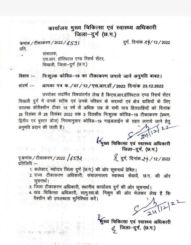 दुर्ग 25 दिसंबर । S.R.HOSPITAL एस.आर. हॉस्पिटल एंड रिसर्च सेंटर चिखली दुर्ग में दिनांक 26 दिसम्बर 27 दिसम्बर एवं 28 दिसम्बर को तीन दिनों तक निःशुल्क कोवीड टीकाकरण किया जाएगा । टीकाकरण का समय सुबह 10:30 A.M.बजे से 3:30 P.M. बजे रहेगा। नि:शुल्क कोवीड टीकाकरण शिविर में अस्पताल के स्टाफ उनके परिवार के सदस्यों एवं क्षेत्रवासियों को कोविड संक्रमण से बचाव हेतु