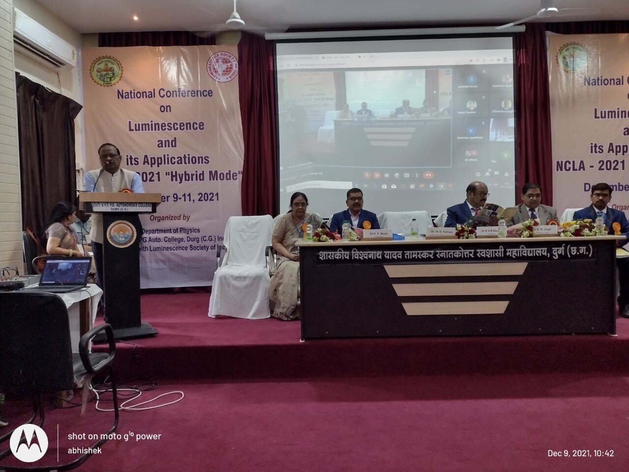 दुर्ग 9 दिसंबर । शासकीय विश्वनाथ यादव तामस्कर स्नातकोत्तर स्वशासी महाविद्यालय, दुर्ग एवं ल्यूमिनिसेंस सोसायटी आॅफ इंडिया के संयुक्त तत्वावधान में 3 दिवसीय राष्ट्रीय सम्मेलन का उद्घाटन सरस्वती वंदना, राज्य गीत एवं द्वीप प्रज्जवलन के साथ प्रारंभ हुआ। सभी अतिथियों का स्वागत पुष्प गुच्छ द्वारा किया गया। राष्ट्रीय सम्मेलन में विषिष्ट अतिथि डाॅ. एच.के. पाठक, कुलपति, भारती विष्वविद्यालय, दुर्ग ने अपने उद्बोधन में भौतिकी से संबंधित आविष्कारों, ट्रांजिस्टर एवं एलईडी के बारे में बताते हुए कहा कि हम गुणवत्ता परक शोध के क्षेत्र में अभी भी बहुत पीछे है और हमें अपने शोध को गुणवत्तापरक बनाने के लिए प्रयास करते रहना चाहिए। जिससे हम अपनी पहचान अंतर्राष्ट्रीय स्तर पर बना सके, उन्होंने कहा शोध आम आदमी के स्तर को ऊपर उठाने के लिए होना चाहिए। विज्ञान एवं टेक्नोलाॅजी दोनांे के सहयोग से ही देष का सकारात्मक विकास संभव हो सकता है।